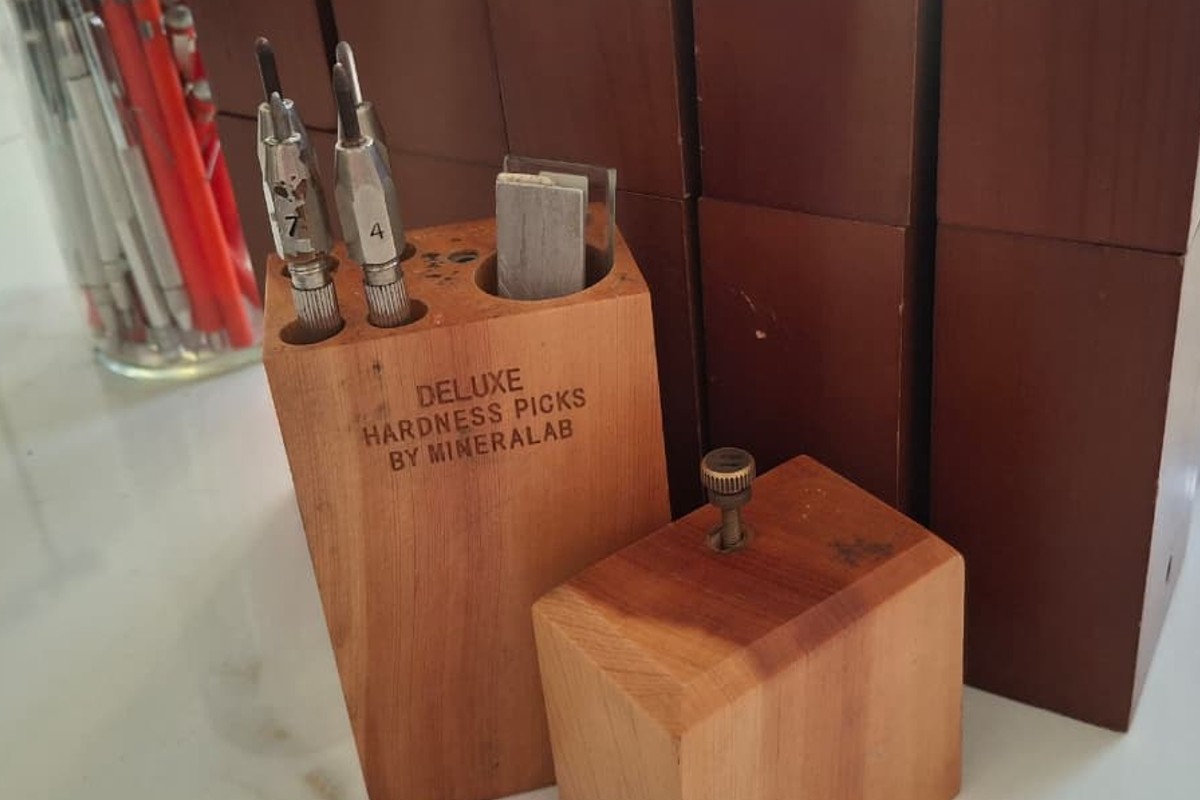 Dalam kegiatan ini, mahasiswa dituntut untuk dapat mendeskripsikan karakteristik dari setiap mineral seperti warna, kilap, warna goresan, kekerasan, bentuk, pecahan, belahan, transparansi, dan kemagnetan. Dalam mengidentifikasi mineral, mahasiswa menggunakan berbagai peralatan pendukung. Salah satunya adalah hardness picks, yaitu kit untuk mengidentifikasi mineral yang terdiri dari scratcher/pick pengukur kekerasan dengan skala Mohs 2–9, pelat uji kekerasan dengan nilai 2,5; 3,5; dan 5,5, serta streak plate untuk menguji warna goresan mineral. Selain itu, mahasiswa juga memanfaatkan magnet untuk menguji sifat kemagnetan mineral, khususnya pada mineral seperti magnetit dan pirotit. Alat lain yang digunakan meliputi lup untuk pengamatan visual detail, serta HCl untuk mengidentifikasi mineral karbonat seperti kalsit, dolomit dan lainnya. Dalam praktikum mineralogi ini, para mahasiswa juga menggunakan mikroskop stereo binokuler yang membantu mahasiswa mengamati bentuk, tekstur, dan sifat mineral secara lebih detail.